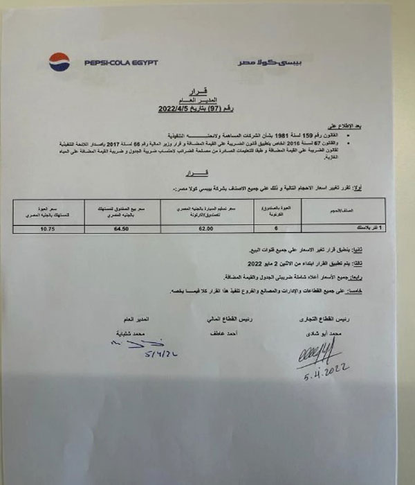 قررت شركتى بيبسي وكوكاكولا مصر زيادة أسعار منتجاتهما بمبلغ 75 قرشا للعبوة، وذلك بداية من 2 مايو القادم، وقامت الشركة بإبلاغ الموزعين بذلك.