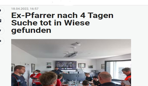 تكثف رجال الشرطة النمساوية لكشف غموض العثورعلى جثة قس سابق يبلغ من العمر 82 عام ، في أحد في الغابات بغرب النمسا ، في منطقة Bürmoos (Flachgau) يوم الأحد الماضى الموافقر13 أبريل 2022 يوم عيد الفصح ، وأستبعدت الشرطة بعدم وجود شبهة جنائية أو طرف ثالث