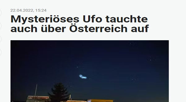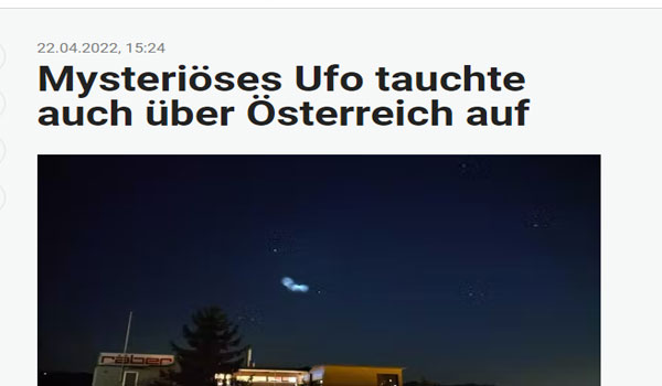 ظهر فجأة جسم أسطواني عامض مساء يوم أمس الحميس ، قبل الساعة العاشرة مساءً بقليل ، في سماء النمسا وسويسرا كان برتقالي اللون ومتوهجًا، وقد ثبت ذلك الآن من خلال مقطع فيديو ، ثم اختفى فجأة في وقت لاحق، وقد لاحظ الظاهرة الغامضة عشرات من سكان عدة مدن نساوية