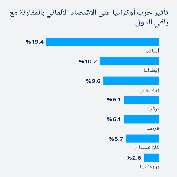 من مؤشرات تنامي التداعيات السلبية لحرب أوكرانيا على الاقتصاد الألماني، ما أعلنته الحكومة في برلين (27 أبريل / نيسان 2022) بشأن توقعات النمو الاقتصادي خلال العام الجاري، إذ خفضت توقعات نموا الناتج المحلي الإجمالي إلى حدود 2.2%. تشاؤم دوائر صنع القرار الاقتصادي في برلين شمل أيضا أسعار الاستهلاك، إذ استبعدت تراجعها على المدى المنظور، فيما سيستمر معدل التضخم في الارتفاع ليصل إلى 6.1%، وهو معدل نادر في ألمانيا ولم يتم تسجليه إلا في حالات استثنائية، كالفترة التي تلت توحيد الألمانيتين أو خلال الأزمة النفطية في سبعينات القرن الماضي. ويذكر أن التضخم وصل إلى مستوى قياسي قدره 7.3% خلال شهر مارس الماضي.