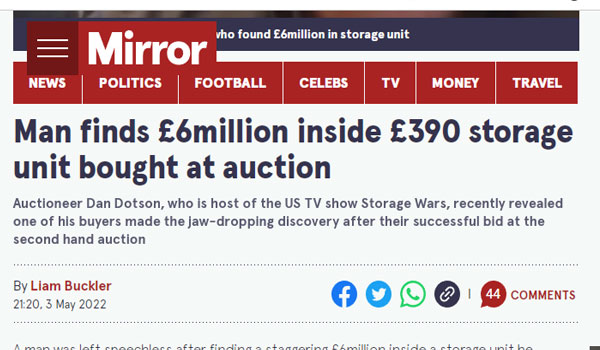 اعتقد رجل اميركي من هواة المزاودة على وحدات التخزين المجهولة المالك، أنه قد تعثر أخيرا بضربة حظ لا تصدق، حين فتح وحدة تخزينه التي اشتراها بـ 390 جنيه، ليجد فيها ما يقارب ستة مليون جنيه نقدا، لكن فرحته تبخرت حل مكانها خيبة امل، عندما انقض المحامون لانتزاعها من بين يديه، لكنه لم يخرج من هذا خالي الوفاض.