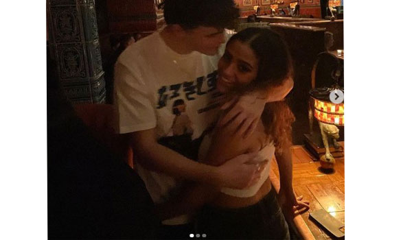وظهرت جنا بملابس تظهر أجزاء كبيرة من جسدها وهي تحتضن حبيبها.