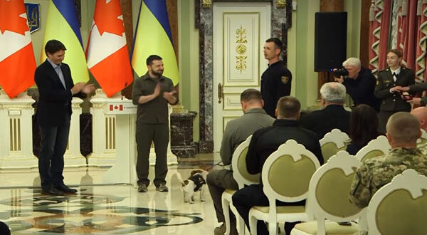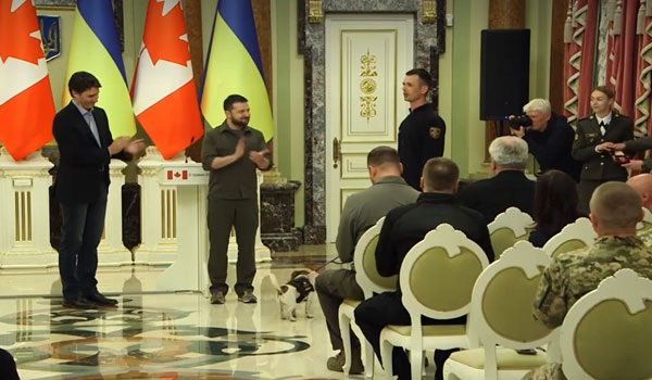 لم يتوقع هذا الكلب الأوكراني المرفقة صورته أعلاه أن ينال وساماً من أعلى شخصية في بلاده وبحضور رئيس الوزراء الكندي أيضاً.