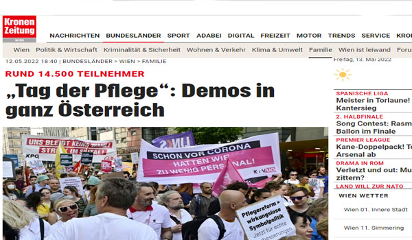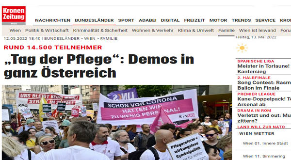 نظم اليوم الأربعاء الموافق 12 من مايو 2022 ، مظاهرة من قبل العاملين في مجال الصحة والتمريض في فيينا، بمشاركة كل من جمعية “Health Offensive” ونقابة العمال GÖD الصحية، وجمعية فيينا الطبية، ونقابة العمال، وOGB، بدأت المظاهرة في تمام الساعة الثالثة بعد الظهر من محطة مترو أنفاق رقم 4 باللأند إشتراسة، وانتهت في حوالى الساعة 4:30 مساء فى حديقة سيجموند فرويد بالحى الأول ، وكان من أبرز العروض أداء فرقة “Russkaja”.