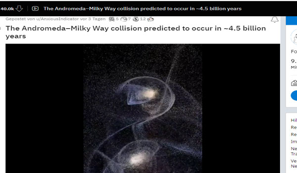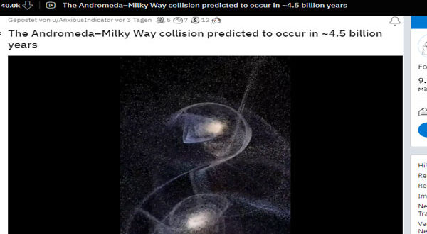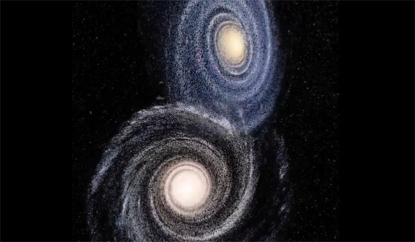 توقع مقطع فيديو تخيلي، التصادم الذي سيحدث بعد 4.5 مليار سنة، بين مجرة “أندروميدا” ومجرة “درب التبانة” التي تنتمي إليها المجموعة الشمسية التي تضم الأرض وبقية الكواكب.
