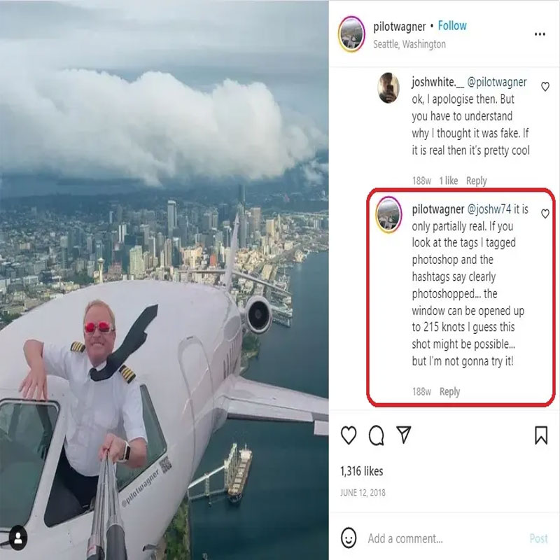 فقد أظهرت الصورة رجلاً يرتدي ملابس طيّار ويخرج رأسه من شبّاك الطائرة ليلتقط “سيلفي”، إلا أن عوامل عدة شككت في صحة الصورة، بحسب ما أفادت وكالة “فرانس برس”.