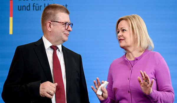 وزيرة الداخلية الألمانية نانسي فيزر ورئيس مكتب حماية الدستور توماس هالدنفانغ يقدمان سويا في برلين التقرير حول التطرف اليميني في الأجهزة الأمنية