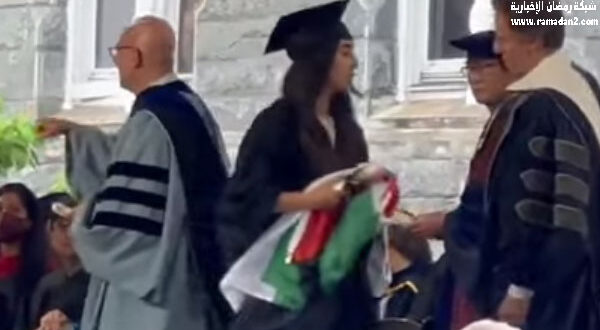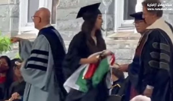 حيث أظهر المقطع المنشور قيام طالبة في جامعة جورج تاون الأمريكية بحمل العلم الفلسطيني خلال حفل التخرج وتقديم الشهادات.