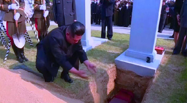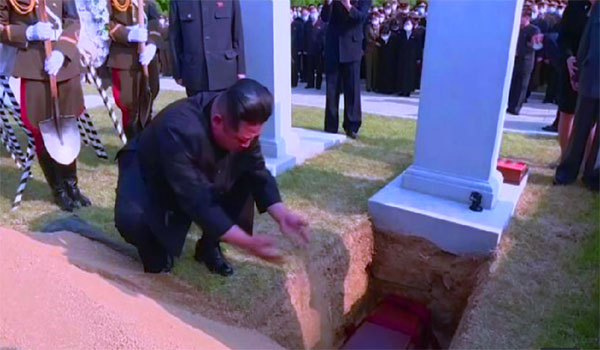 وكان الرئيس الكوري الشمالى هو الوحيد بين المشيعيين من دون كمامة في الجنازة التي لم يتمالك نفسه فيها، إلى درجة أنه كاد يبكي أمام نعش معلمه، ثم ظهر في الفيديو وهو يشارك بحمل تابوته إلى المقبرة، حيث أهال بنفسه التراب على قبره قبل الدفن ، وهذا هو حال لسان كل دكتاتور