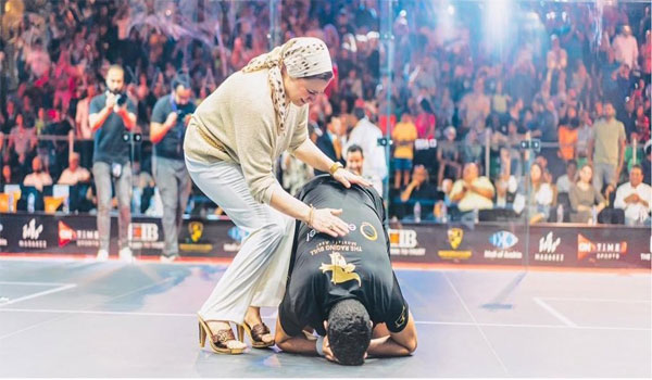 لم تتمالك والدة البطل المصري مصطفى عسل نفسها من الفرحة بفوز ابنها بلقب بطولة الثمانية الكبار في الاسكواش «PSA world tour finals» لموسم 2021-2022، ونزلت إلى أرض الملعب لعناق ابنها بعد سجوده على أرض الملعب.