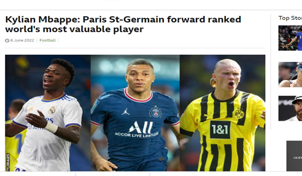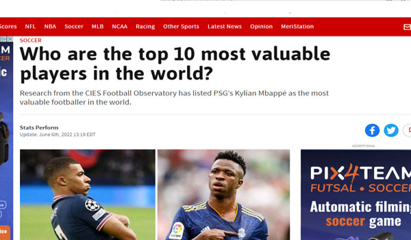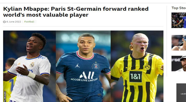 تصدر النجم الفرنسي كيليان مبابي، لاعب باريس سان جيرمان، قائمة أغلى 100 لاعب في العالم، بحسب تقرير للمركز الدولي للدراسات الرياضية في سويسرا CIES فيما احتل المصري محمد صلاح مركزاً متأخراً، ولم يظهر اسم الجزائري رياض محرز.