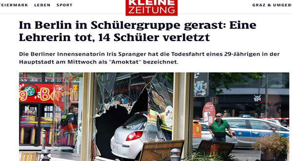 تلاميذ من ولاية هيسن وسط البلاد في رحلة مدرسية إلى العاصمة برلين، تعرضوا لهجوم بالدهس في أحد الشوارع، ما أدى لمقتل معلمة وإصابة العديد من التلاميذ. والشرطة تعلن العثور على “ملصقات” عليها عبارات عن تركيا داخل السيارة.
