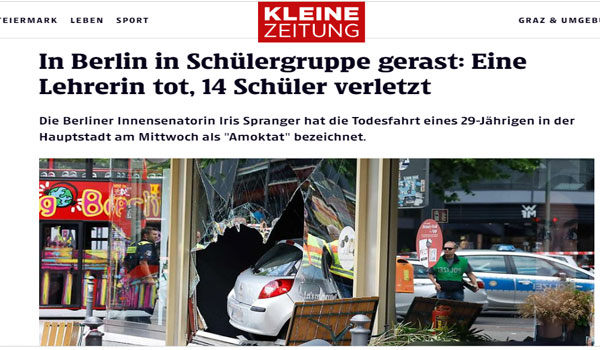 وكان قائد السيارة قد صدم جمعا من الناس على رصيف في شارع كودام التجاري الرئيسي في برلين بالقرب من كنيسة الذكرى، ثم سار بالسيارة لحوالي 200 متر أخرى في شارع تاونتسيهنشتراسه حيث اصطدم بواجهة محل.