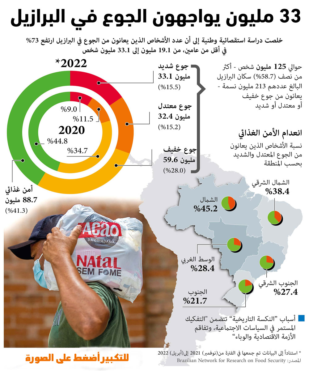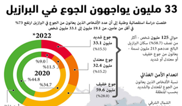تقول الدراسة، التي طورتها الشبكة البرازيلية للأبحاث حول السيادة والأمن الغذائي (Rede Penssan)، وفق ما نقلتها تقارير إعلامية، إن عدد المنازل التي يسكنها جائعون، ارتفع من 9 في المئة (19.1 مليون شخص)، إلى 15.5 في المئة (33.1 مليون شخص)، وتم جمع البيانات بين نوفمبر وأبريل الماضيين.