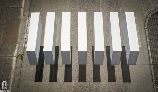 فتصميم ممر المشاة يخلق وهماً بصرياً يجعل السائقين يعتقدون أن خطوطه البيضاء هي أشياء مثل الصناديق الموجودة في الشارع، فتجبرهم على تخفيف سرعتهم.