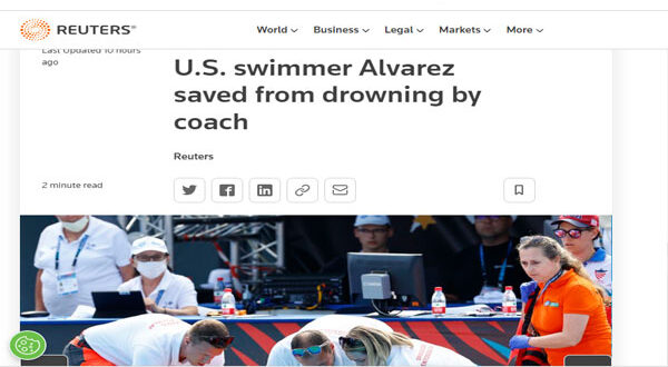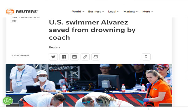 أُنقذت السباحة الأمريكية أنيتا ألفاريس من الغرق، في قاع المسبح من قبل مدربتها، بعد أن أغمي عليها خلال أدائها ضمن منافسات السباحة الإيقاعية في بطولة العالم للسباحة في بودابست.
