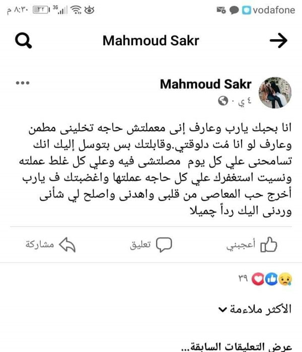 وكان آخر منشور له على موقع التواصل الاجتماعي “انا بحبك يارب وعارف إنى معملتش حاجه تخلينى مطمن، وعارف لو انا مُت دلوقتي وقابلتك بس بتوسل إليك انك تسامحنى علي كل يوم مصلتشى فيه وعلى كل غلط عملته، ونسيت استغفرك علي كل حاجه عملتها واغضبتك ف يارب أخرج حب المعاصى من قلبى، واهدنى واصلح لي شأنى وردنى اليك رداً جميلا”.