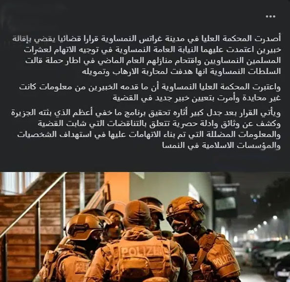عقب أن كشف الإعلامي الفلسطيني والمذيع بقناة “الجزيرة”، تامر المسحال، القضية في برنامجه “ما خفي أعظم“، كشفت صفحة “النمسا هنا” على “فيسبوك”، بأن المحكمة العليا في مدينة غراتس النمساوية أصدرت قرارا قضائيا يقضي بإقالة خبيرين اعتمدت عليهما النيابة العامة النمساوية في توجيه الاتهام لعشرات المسلمين النمساويين واقتحام منازلهم العام الماضي في إطار حملة قالت السلطات النمساوية انها هدفت لمحاربة الارهاب وتمويله.