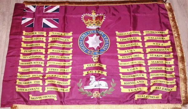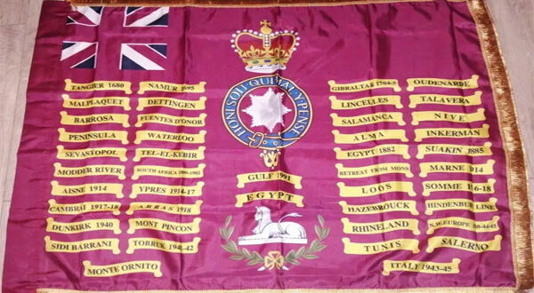 الألوان الملكية للكتيبة الأولى لها خلفية قرمزية وتحمل نجمة وسام الرباط في الوسط، مع رمز التاج الإمبراطوري أعلاه. إضافة إلى ذلك، هناك أسماء أبرز 47 من أصل 117 معركة خاضتها الكتيبة في تاريخها.