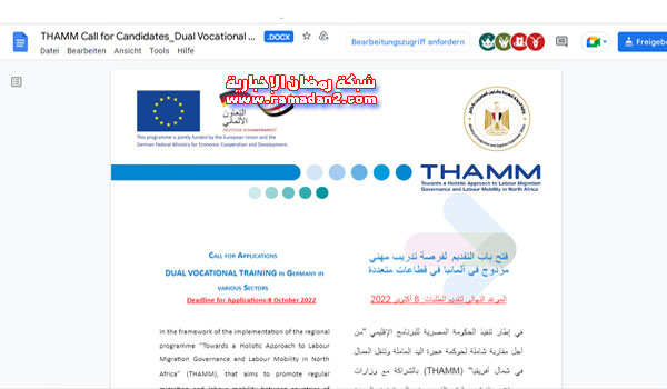 يبدأ اليوم التقديم للباحثين عن فرص تدريب مهني بألمانيا في مجالات الخبازة والكهرباء والإلكترونيات والمعادن، بالإضافة إلى مجال الفندقة والضيافة، يبدأ من اليوم وحتى 8 من أكتوبر 2022، وسيتم عقد مقابلات شخصية مع المرشحين المدرجين في القائمة المختصرة من خلال ممثلين من وزارة الدولة للهجرة وشئون المصريين بالخارج، جنبًا إلى جنب مع الوكالة الألمانية للتعاون الدولى (GIZ) في مصر ووكالة التوظيف الفيدرالية الألمانية (BA)، كذلك سيتوفر لهؤلاء المرشحين المختارين ندوة تعريفية مفصلة أونلاين حول البرنامج ومزاياه وعملية التوظيف في ألمانيا قبل المقابلات، وسيظل المرشحون المختارون بحاجة إلى إجراء مقابلات أخرى مع أصحاب العمل من ألمانيا.