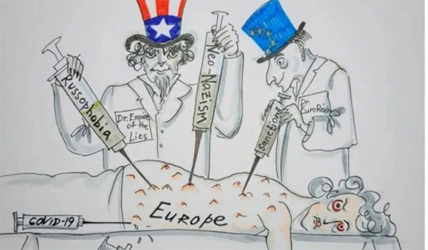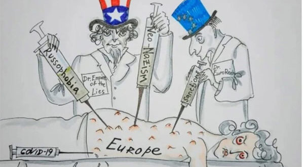 وفوقه طبيبان يرتديان زي كتب على أحدهما “إمبراطورية الأكاذيب” ويمثل أميركا والآخر “الرايخ الأوروبي” ويمثل الإتحاد الأوروبي