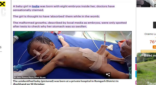 ولدت طفلة وهي تحمل داخل معدتها 8 أجنة في حالة غريبة ونادرة شهدتها الهند، حسبما أفادت صحيفة “ديلي ميل” البريطانية.
