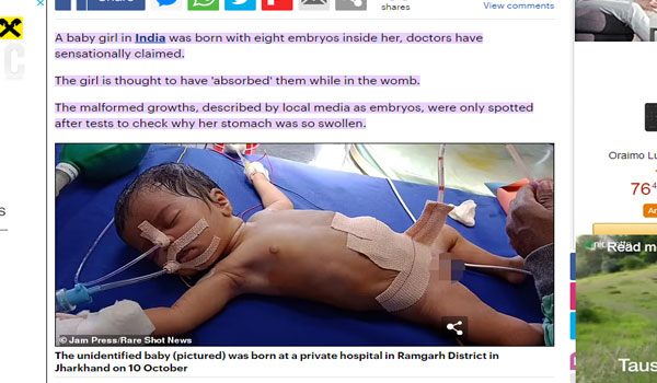 وولدت الطفلة في مستشفى في منطقة رامجاره في ولاية جاركند الهندية، في 10 أكتوبر الماضي، وتمت إزالة الأجنة الثمانية من الفتاة في عملية جراحية استغرقت 90 دقيقة، بعد حوالي 3 أسابيع من ولادتها.