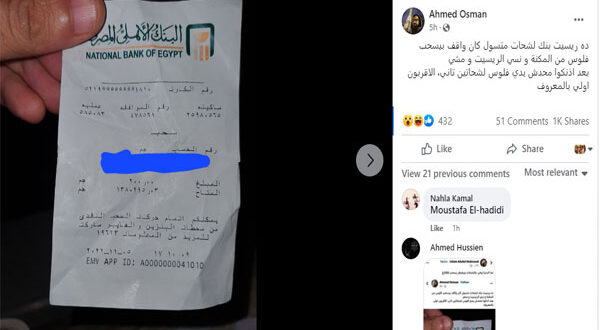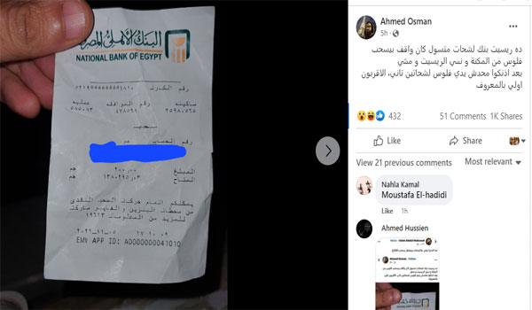 قرر عثمان نشر الإيصال لتوعية الجميع بعدم التبرع لمتسولين في الشارع، وكتب: “ده ريسيت بنك لشحات متسول كان واقف يسحب فلوس من الماكينة ونسي الريسيت ومشي، من فضلكم محدش يدي فلوس لشحاتين تاني، الأقربون أولى بالمعروف”.