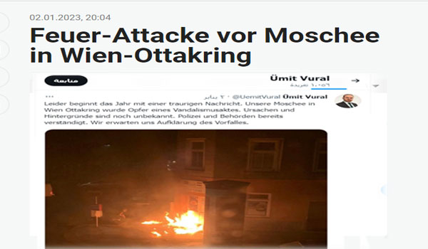 نشرت الصحف النمساوية اليوم الثلاثاء الموافق 3 من يناير 2023 ، أن مسجد في العاصمة النمساوية فيينا ، تَعرَّض لهجوم أسفر عن اشتعال النيران في مدخله. وفتحت الشرطة تحقيقاً في الحادثة، إلا أن هُويَّة منفذ الهجوم لم تُحدَّد بعد.