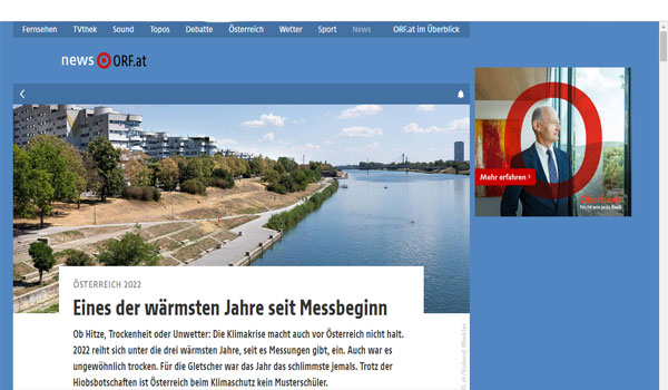 أكد المعهد النمساوي للأرصاد الجوية والديناميكا الجيولوجية أن عام 2022، كان من أكثر الأعوام دفئًا في النمسا، منذ بَدْء تسجيل درجات الحرارة قبل 256 عاماً.