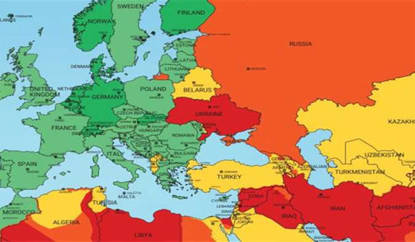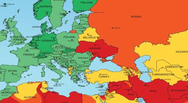 وهذه هي الدول التي تم تمييزها على الخريطة، باللون الأحمر، مما يعني «مخاطرة عالية جدًا». على سبيل المثال، تم توضيح أن إيران «احمر خجلًا» بسبب الاحتجاجات التي تجري هناك منذ بعض الوقت.