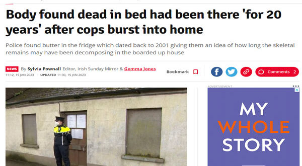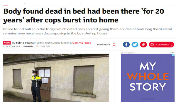 عثرت الشرطة الأيرلندية في إحدى مقاطعات البلاد على هيكل عظمي بشري ممدد على السرير منذ أكثر من عشرين عاما، وفقا لما ذكرت موقع “ويلز أون لاين” البريطاني، الاثنين.
