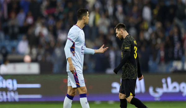 تصافح النجمان ليونيل ميسي وكريستيانو رونالدو قبل بداية مباراة الهلال والنصر ضد باريس سان جيرمان الفرنسي التي أقيمت على ملعب الملك فهد في العاصمة السعودية الرياض.