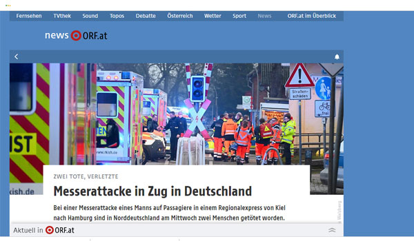 ونقلت الوكالة في وقت لاحق عن وزيرة داخلية ولاية شليسفيغ هولشتاين، زابينه زوتيرلين فاك، قولها إن شخصين قتلا وخمسة أصيبوا في الهجوم الذي وقع في حوالي الساعة الثالثة عصرا بالتوقيت المحلي.