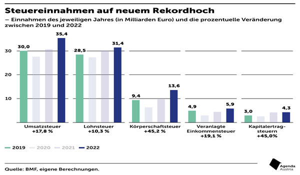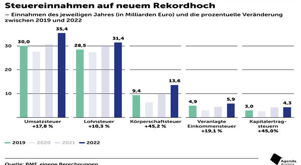 يرجع ذلك إلى بعض الأسباب الرئيسية وهي الانتعاش الاقتصادي ونسبة التضخم المرتفع في النصف الثاني من العام الماضى 2022″ ، كما صرح الخبير الاقتصادي مارسيل جوتيرت في مقابلة صحفية مع صحيفة ستاندارد النمساوية اليومية، حيث احتسب معدل التضخم للعام بأكمله جوالى 8.6 في المائة ، وفي أواخر الخريف كان في بعض الأحيان أكثر من عشرة في المائة. يعمل هذا على زيادة الإيرادات الحكومية من ضريبة المبيعات ، والتي يتم حصولها على الخدمات والسلع ، إذا أصبحت البضائع أكثر تكلفة في السعر ، تزداد معها الضريبة التي تضاف إلى سعر البضائع وفقًا لذلك ذادت الضرائب حوالى 35.4 مليار يورو