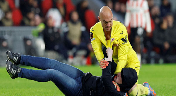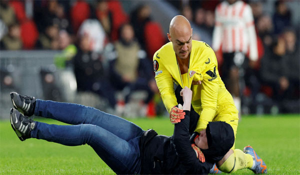 شهدت مباراة أيندهوفن الهولندي وضيفه إشبيلية الإسباني في إياب مرحلة خروج المغلوب من بطولة الدوري الأوروبي لكرة القدم، مشهداً مفاجئاً وغير معتاد بعدما دخل حارس مرمى الأخير في معركة مع مشجع.