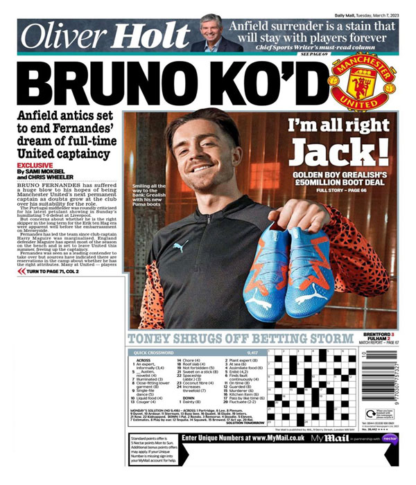 أما صحيفة “ديلي ميل” فعنونت: “إقصاء برونو.. سلوك آنفيلد قد ينهي حلم فيرنانديز في حمل شارة قيادة اليونايتد بصورة دائمة”.