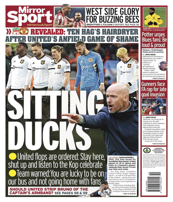 كما كتبت صحيفة “ميرور”: “بدون حماية.. أمر لاعبي اليونايتد المتخبطين بالجلوس والصمت والاستماع لاحتفالات ليفربول.. تحذير الفريق: أنتم محظوظون بالتواجد في الحافلة وعدم الذهاب للمنزل رفقة الجماهير”.