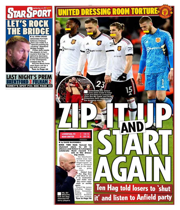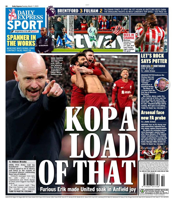 وعنونت صحيفة “ديلي إكسبريس”: “إيريك الغاضب يعاقب اليونايتد بقسوة في سعادة آنفيلد”، في إشارة إلى إجبار تين هاج للاعبيه على الجلوس في صمت والاستماع لاحتفالات لاعبي ليفربول.