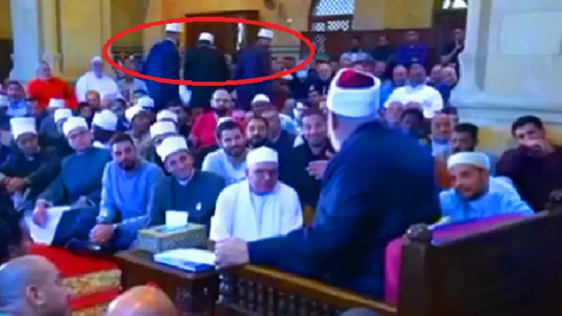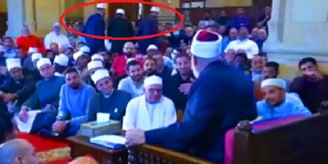 فجأة، لفت نظره قيام 3 طلبة أزهريين وانصرافهم من بين الحضور، فنظر اليهم وتساءل: “.. العيال اللي قامت دول. سلفية دول والا.. ؟ ثم وجه كلامه إليهم وسألهم، بحسب ما نسمعه في الفيديو الذي تعرضه “العربية.نت” أدناه: “إنتو قايمين ليه يا واد إنت وهو.. رايحين فين”؟