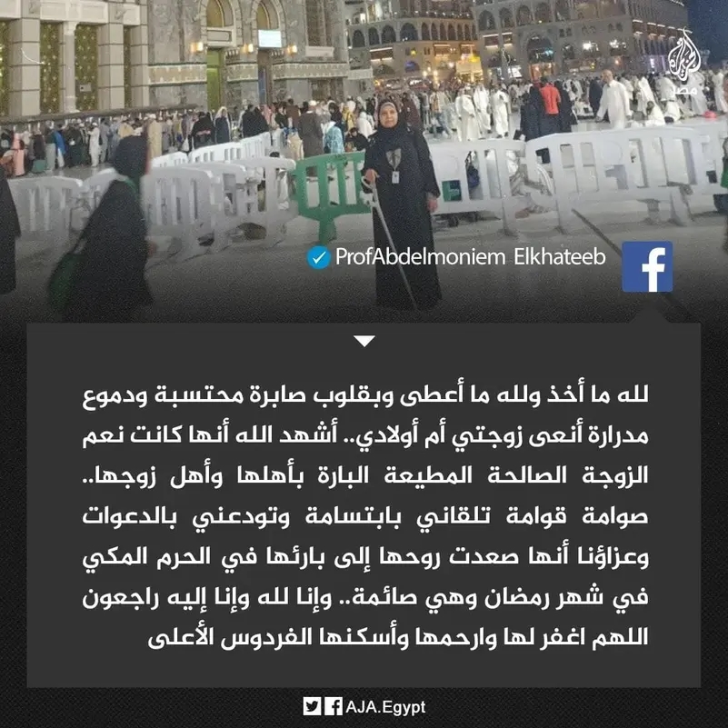 بكلمات مؤثرة ملؤها الوفاء والحزن، نعى المصري “عبدالمنعم الخطيب”، زوجته بكلمات عبر حسابه بموقع فيسبوك، بعد وفاتها في الحرم المكي، حيث تفاعل رواد التواصل الاجتماعي في السعودية مع حزنه على زوجته، فقال في نعي زوجته “هبة” من محافظة قنا المصرية: “لله ما أخذ ولله ما أعطى وبقلوب صابرة محتسبة ودموع مدرارة أنعي زوجتي أم أولادي، توأم روحي رفيقة دربي زهرة فؤادي حسنتي في الدنيا وبسمتي وقسمتي وجليستي وأنيستي”.