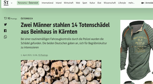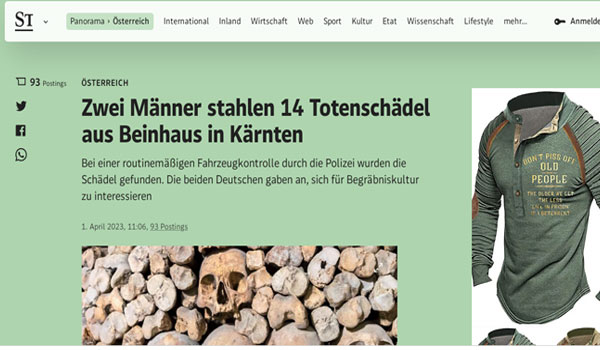 سرق ألمانيان 14 جمجمة من مدفن عظام موتى في كنيسة بجنوب النمسا. وقالت الشرطة النمساوية إنه «سيُجرى تحرير بلاغ ضد الرجلين المولعين بثقافة الموتى بعد التحقيق معهما بتهمة تدنيس المقابر».