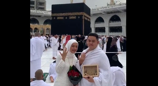 وثق مقطع فيديو، لحظة عقد قران شاب على فتاة من إندونيسيا، بملابس الإحرام، في مطاف الحرم المكي الشريف.