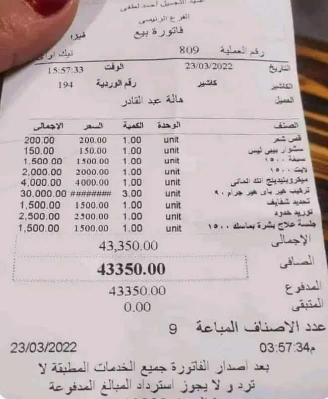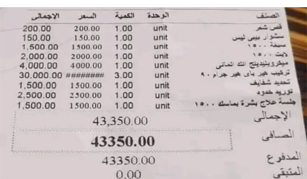 واحتوت الفاتورة التي بلغ إجماليها 43 ألف جنيه، على مورد خدود بسعر 2500 جنيه، وتركيب شعر بالغرامات سعره 30 ألف جنيه، وصبغة بـ 1500 جنيه وغيرها من مستلزمات التجميل.