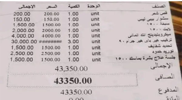 ضجت مواقع التواصل الاجتماعي في مصر خلال الساعات الماضية بتداول صورة فاتورة صالون تجميل لسيدة بمبلغ خيالي، وسط دهشة واستنكار من دفع مثل هذا المبلغ بهدف تصفيف الشعر والاهتمام بالبشرة.