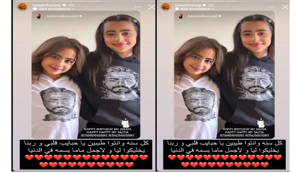 وظهرت بنات تامر حسني، مرتدين ملابس عليها صورته، وعلقت بسمة بوسيل كاتبة: “عيد ميلاد سعيد امايا، عيد ميلاد سعيد تاليا”.