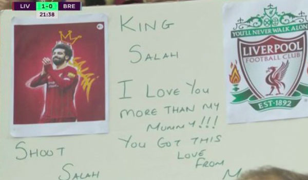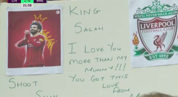 وأظهرت الكاميرات رسالة من مشجع صغير لفريق ليفربول وجهها للنجم المصري محمد صلاح، على لافته وسط الجمهور الكبير قال فيها: “الملك صلاح أحبك أكثر من والدتي، انت تستحق هذا الحب من جانبي.. سدد صلاح”.