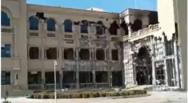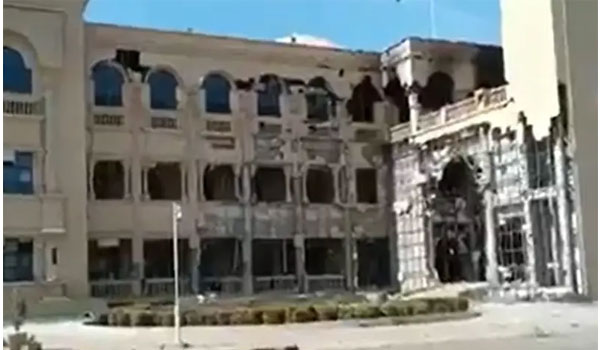 ويبدو في المقطع المصور، حجم الدمار الذي لحق بالقصر المكون من 3 طوابق. كما أن آثار الخراب تبدو واضحة عليه نتيجه الاشتباكات المسلحة بين طرفي النزاع في البلاد، فيما يتصاعد الدخان في سماء المنطقة.