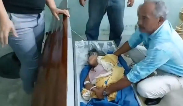 ويُظهر مقطع فيديو نُشر على “تويتر” بيلا مونتويا البالغة 76 عاماً، داخل نعش مفتوح وتتنفس بصعوبة، محاطة برَجلين أتيا لمساعدتها.