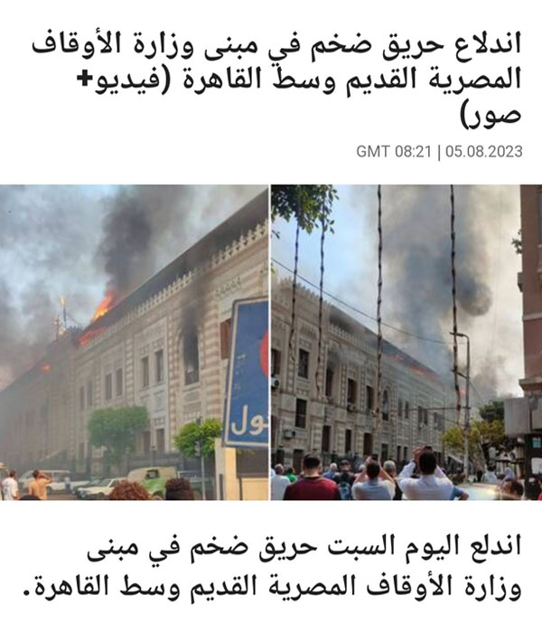 بالفيديو – حريق ضخم في المبنى التاريخي لوزارة الأوقاف المصرية-المصريين مبروك الأرض للأمارات